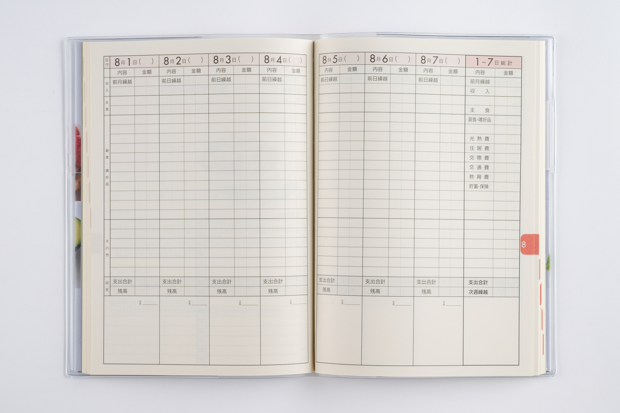 見開き1週間の週計タイプ(曜日フリー)。ベーシックな費目で1週間ごとに収支を計算していきます。