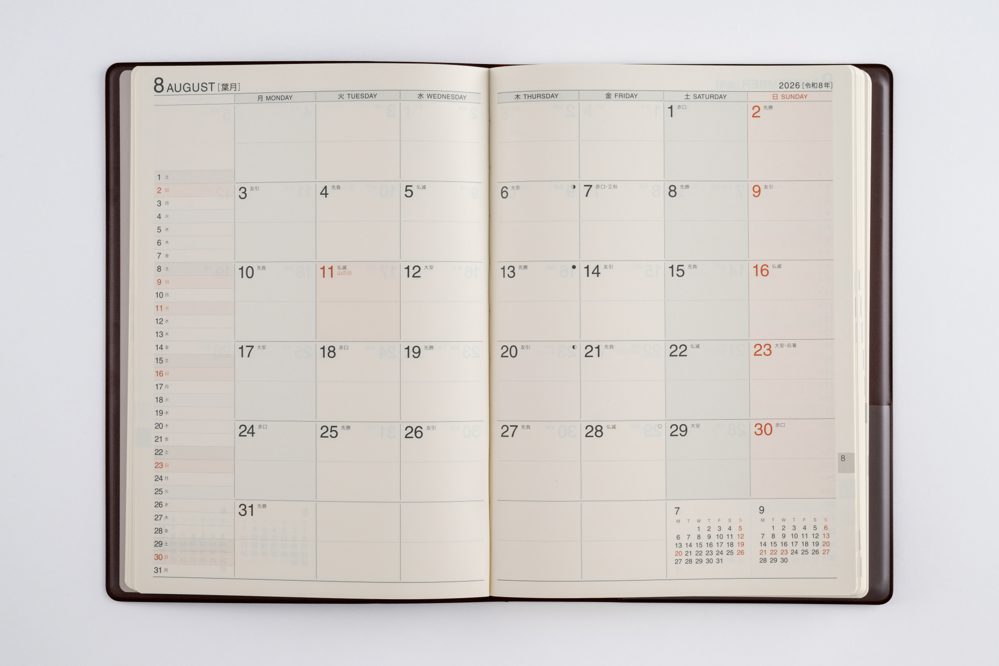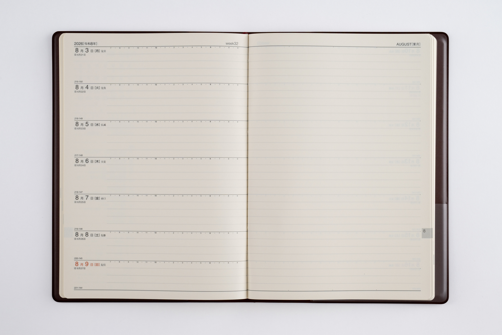シックで落ち着いた茶色のカバー。週間ページは平日の記入スペースが広い、平日重視型のレフト式。毎月の月扉では、月相や暦情報などの役立つ情報も掲載しています。