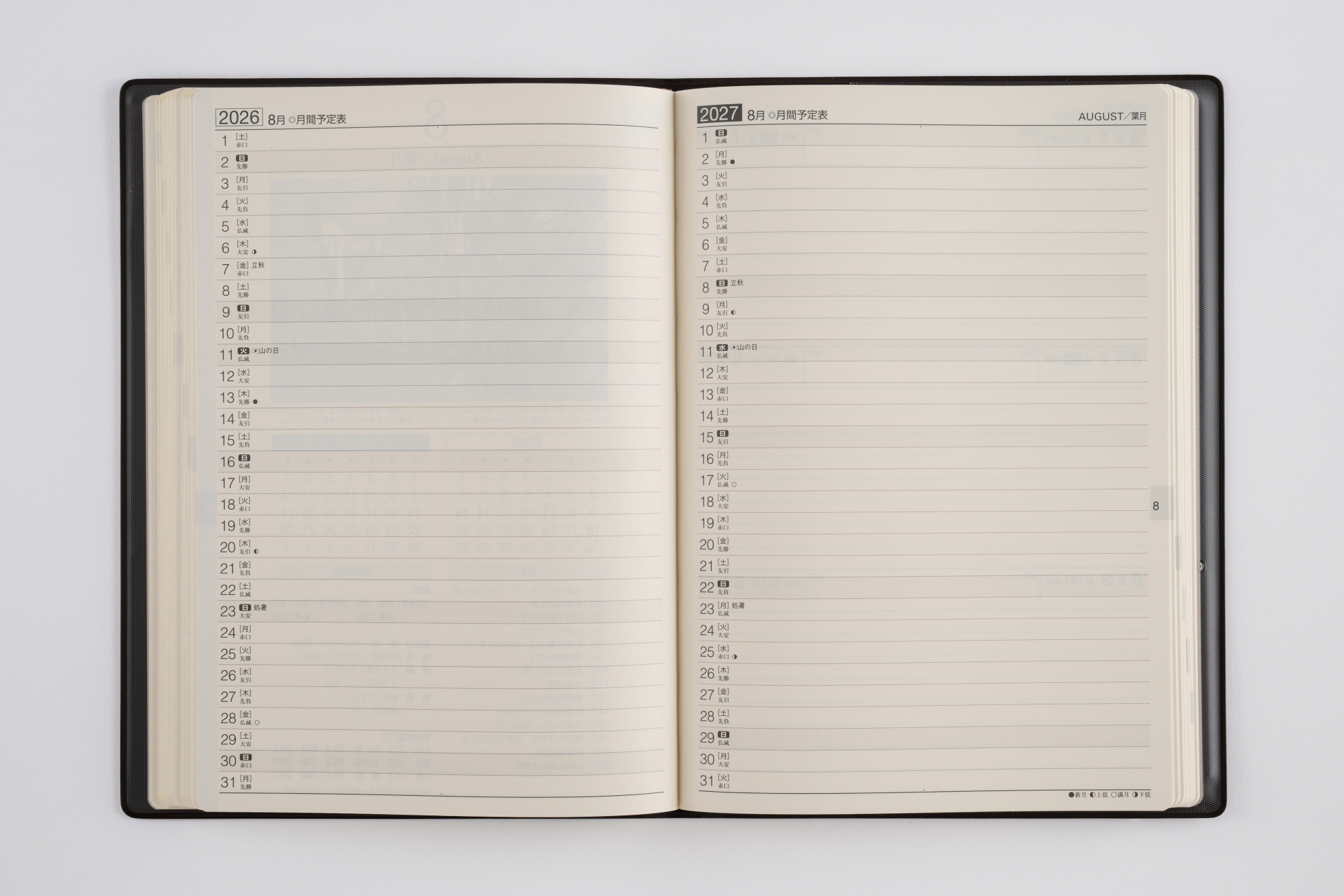 見開き1ヵ月×2年分の横ケイ式予定表。2年分の月間スケジュールの比較に便利。