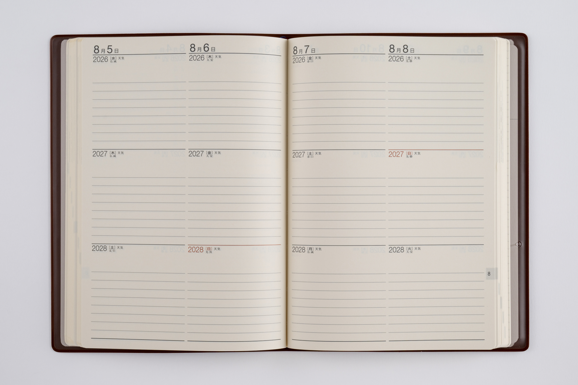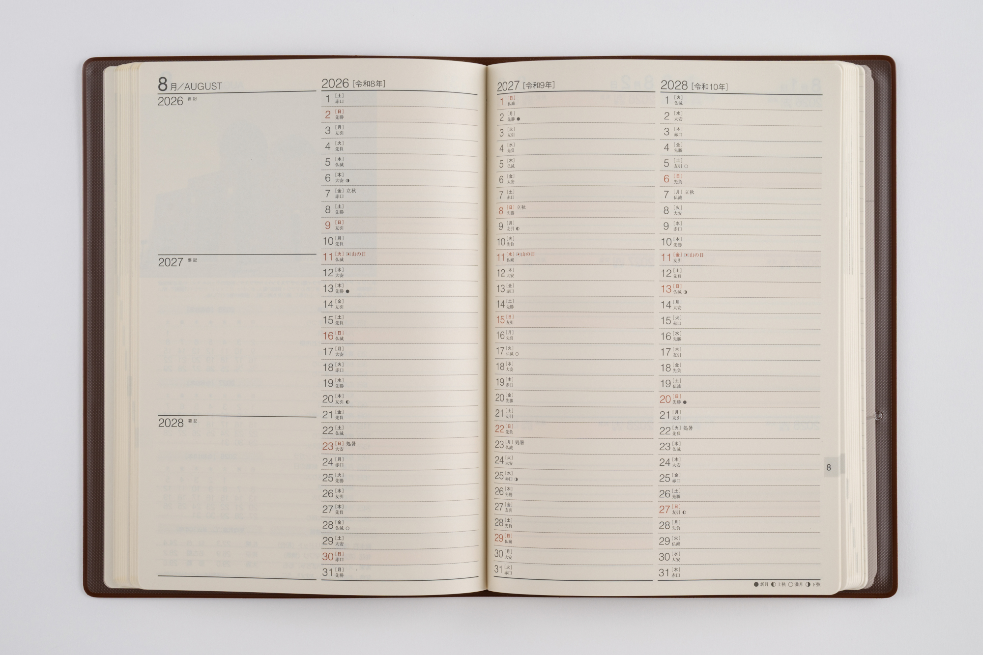3年分の記録を書き込める連用ダイアリー。横ケイ式の月間ページは3年分の予定が一覧でき、ビジネスや年間行事などの管理に役立つ一冊です。シックなブラウンのカバーは、ビジネスにもプライベートにも。