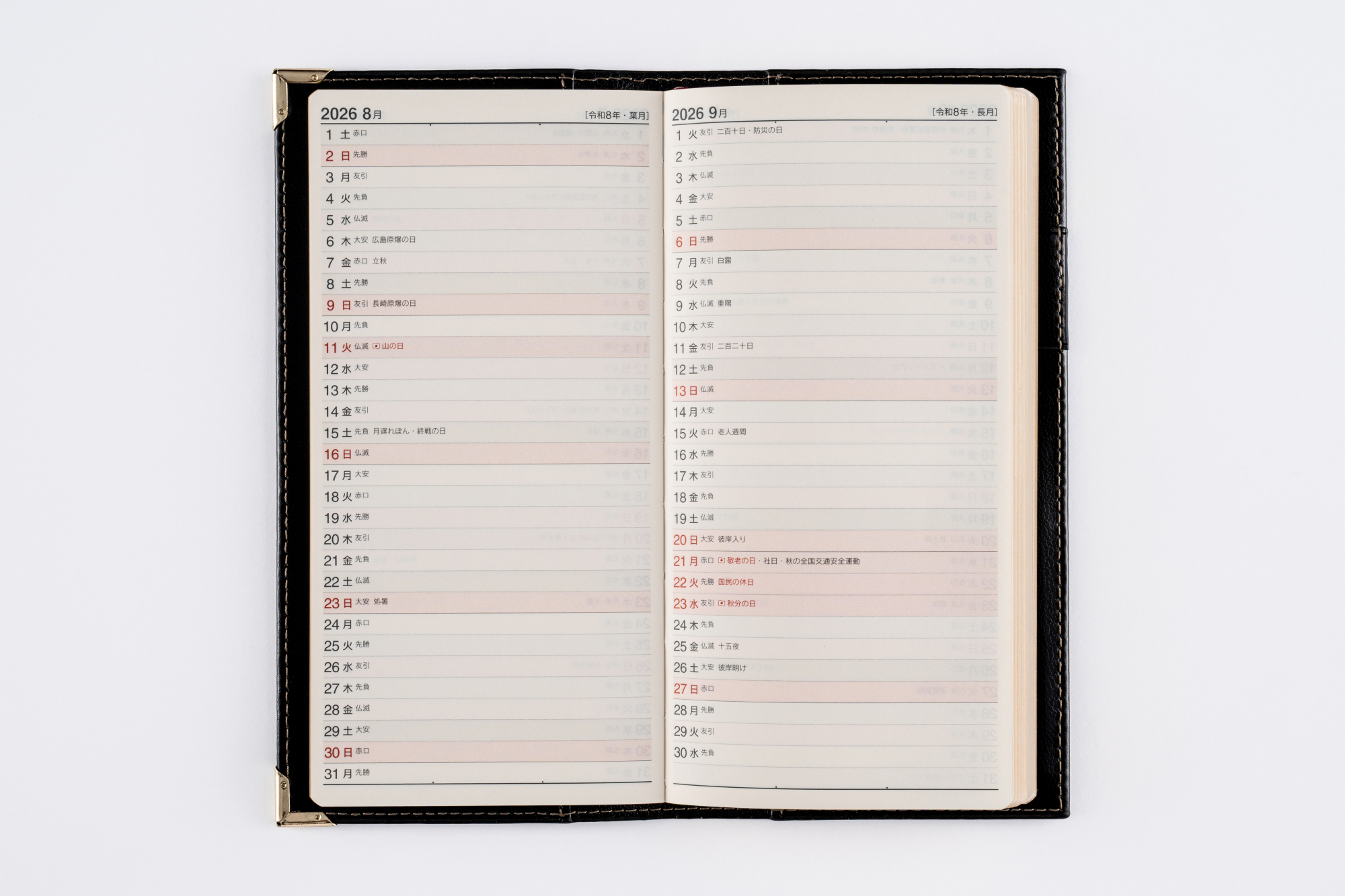 高級皮革調のシックなカバーは、角をしっかり保護する角金具付き。多くのビジネスパーソンに愛されたベーシックな記入形式が人気。月間ページは横ケイ式です。