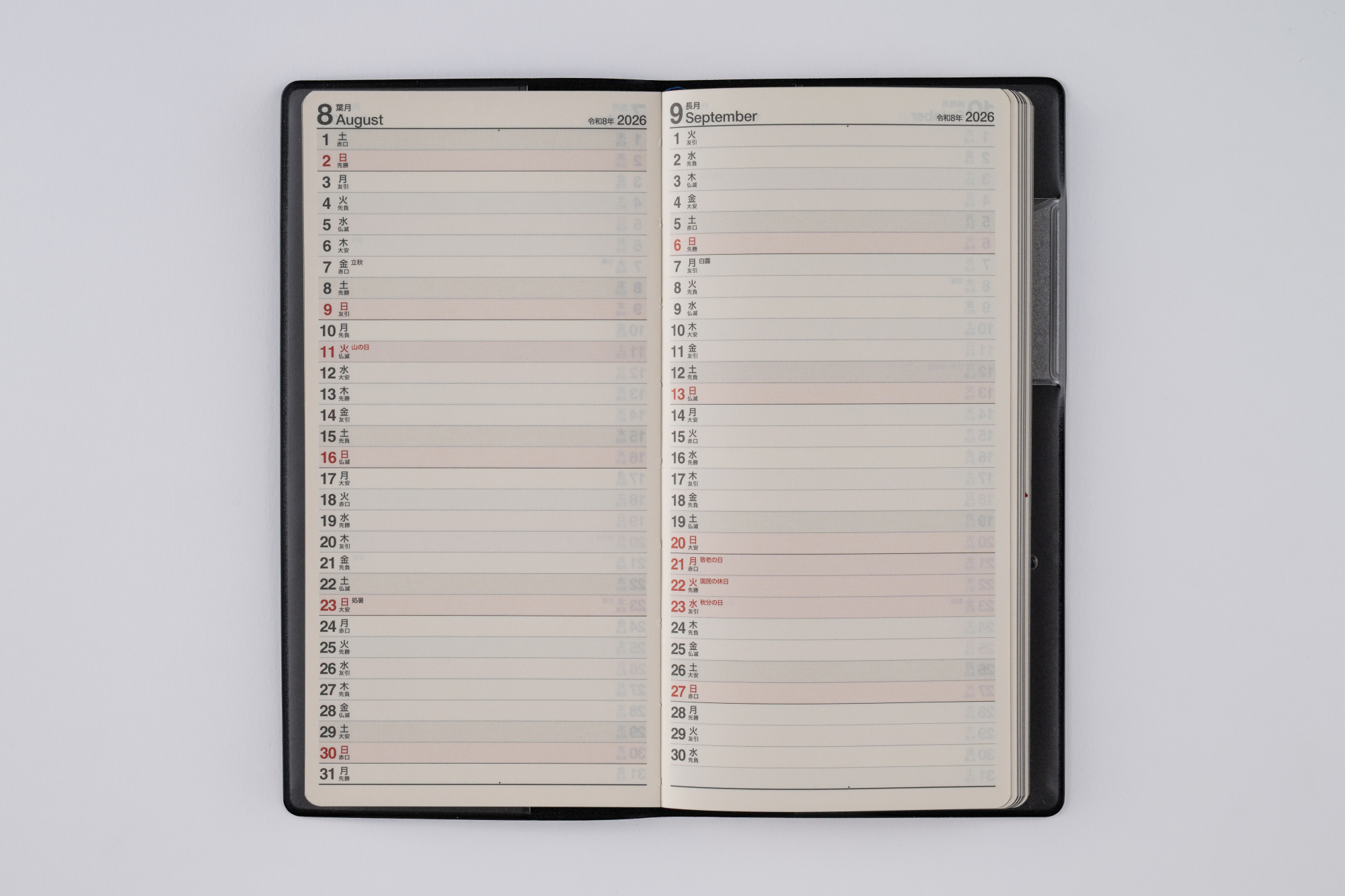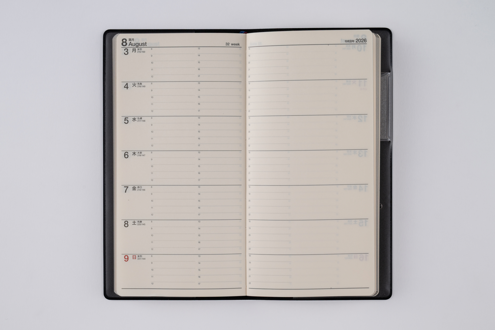 シンプルなカバーデザインに金色のロゴがワンポイント。多くのビジネスパーソンに愛されたベーシックな記入形式が人気。タイム目盛り付きのレフト式週間ページは、細かい時間ごとの予定管理に便利です。