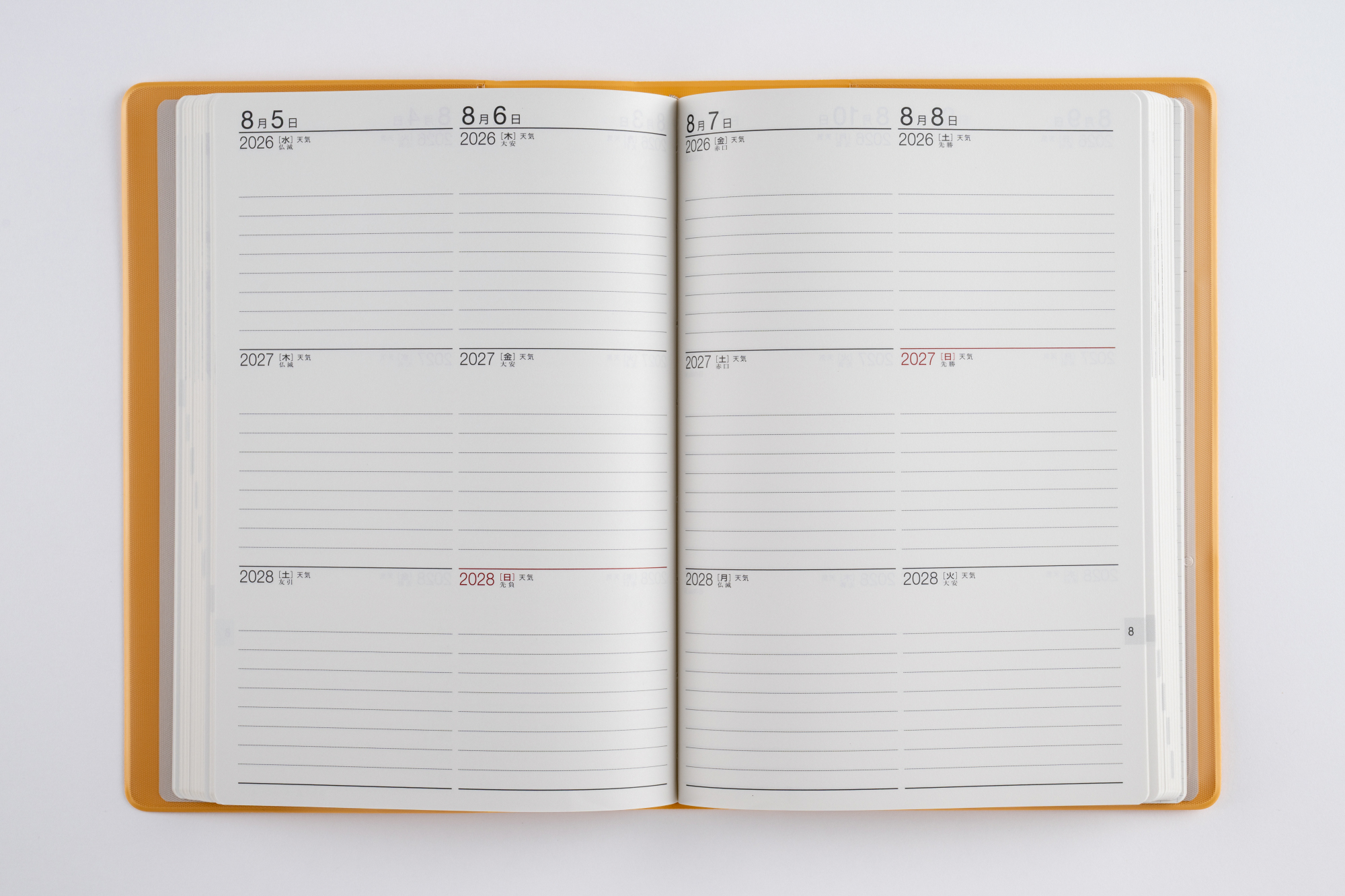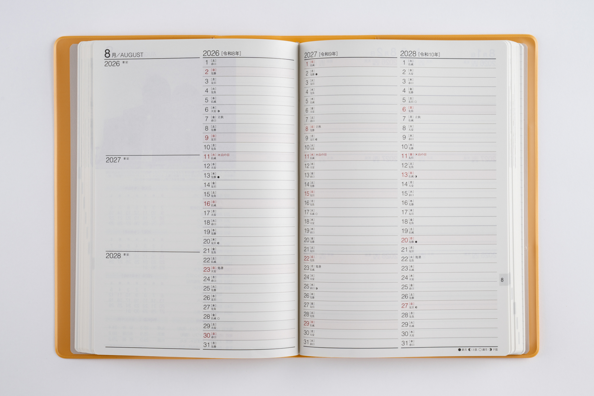 元気のでるオレンジカラーが特徴の3年分の記録を書き込める連用ダイアリー。横ケイ式の月間ページは3年分の予定が一覧でき、ビジネスや年間行事などの管理に役立つ一冊です。