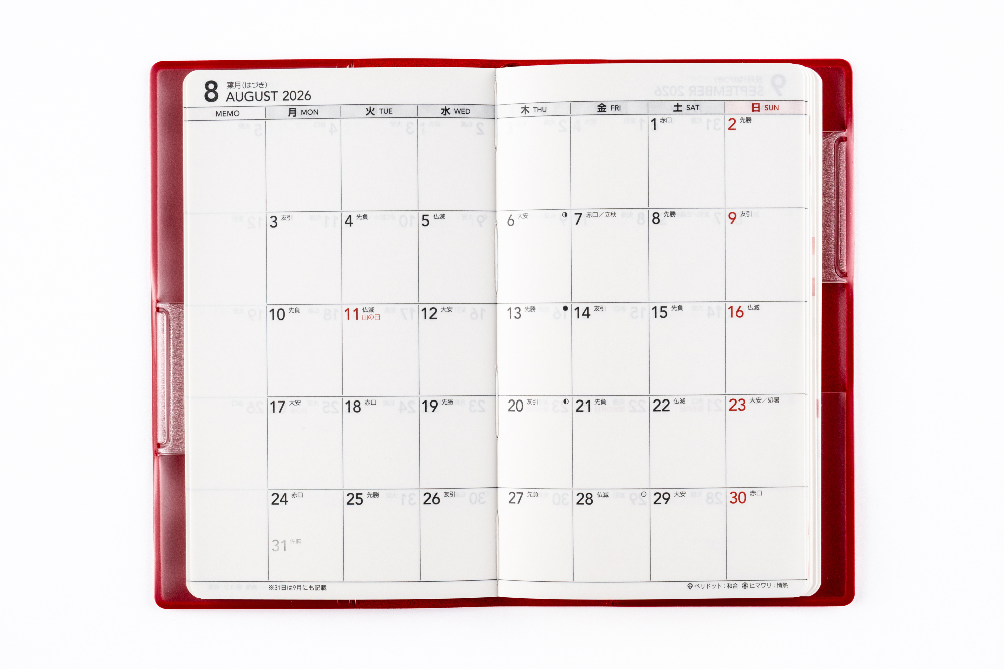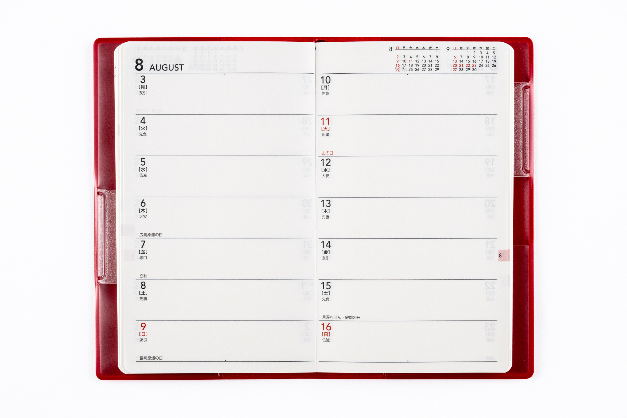 カバーはダブルペンホルダー付きで、2つのペンホルダーにペンを1本差し通せば、カバンの中でも手帳が開かず便利! 小さいサイズながら、切り取りメモなど充実の付録数です。