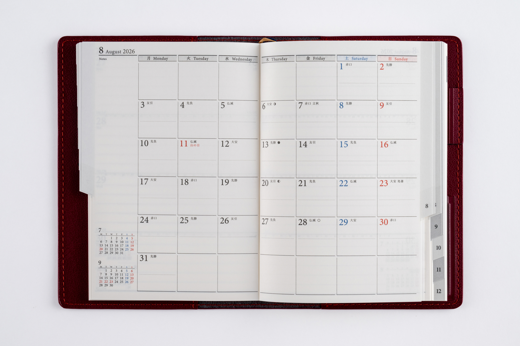 手軽な大きさながら、月別のインデックスやペンホルダーがついた高機能シリーズ。カバーの皮革調らしい色の濃淡も、魅力のひとつ。