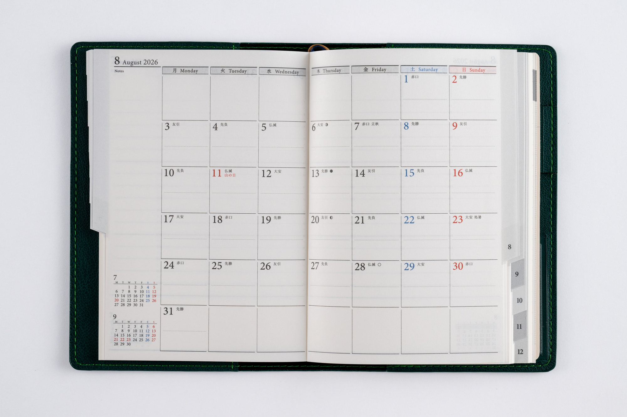 手軽な大きさながら、月別のインデックスやペンホルダーがついた高機能シリーズ。カバーの皮革調らしい色の濃淡も、魅力のひとつ。