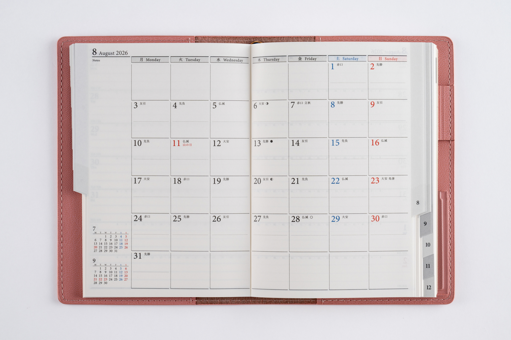 手軽な大きさながら、月別のインデックスやペンホルダーがついた高機能シリーズ。カバーの皮革調らしい色の濃淡も、魅力のひとつ。