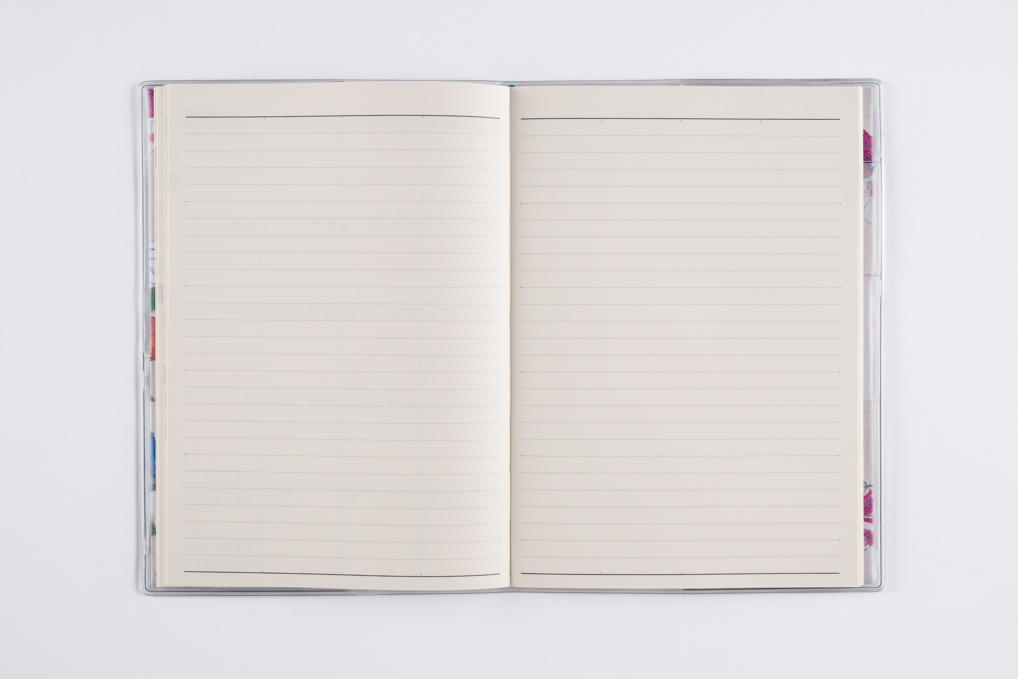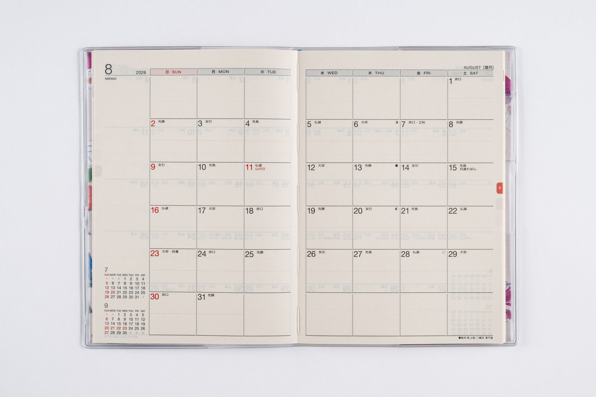 巻末には横ケイメモページ、方眼メモページ、花柄の切り取りメモ付き。