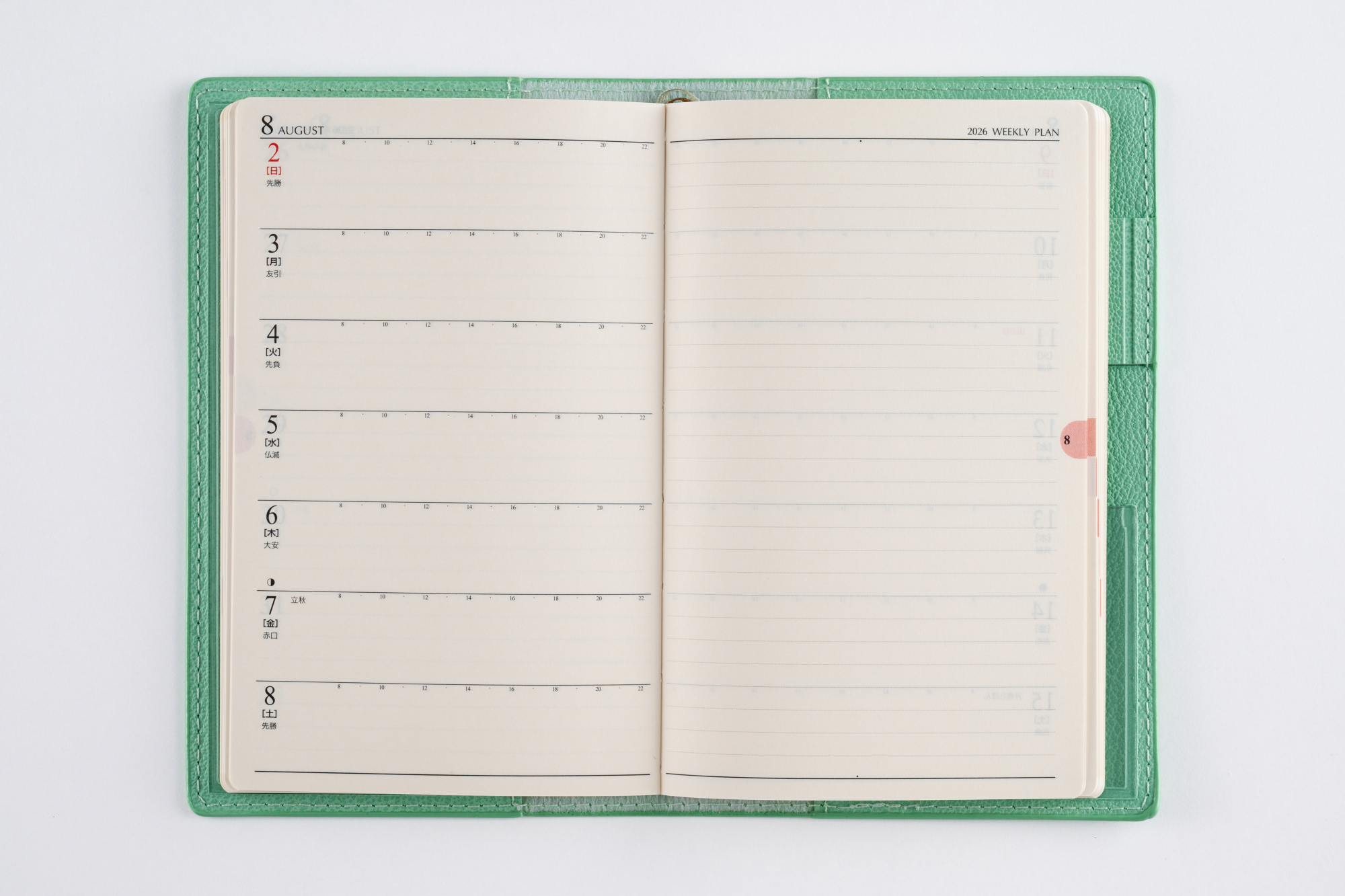 カバーは、高級感がある皮革調で、定番の色でも深みのある色から爽やかな色までさまざま。使用シーンなどの好みに合わせて選べる、豊富なカラーバリエーションをご用意しています。カバーのステッチ糸も、カバー色に合わせて選び抜いています。本文は、目にやさしいクリーム色の用紙を使用しています。細部にまでこだわり抜いた手帳は、毎日使うのがきっと楽しくなるはずです。