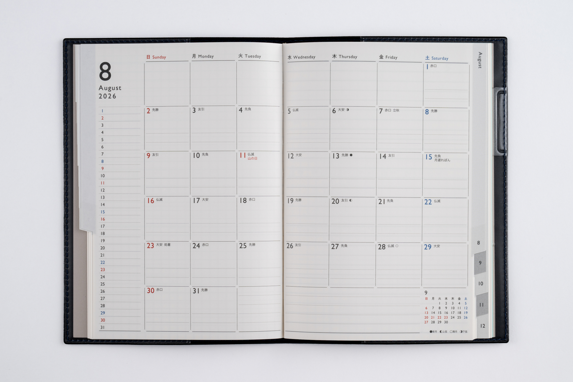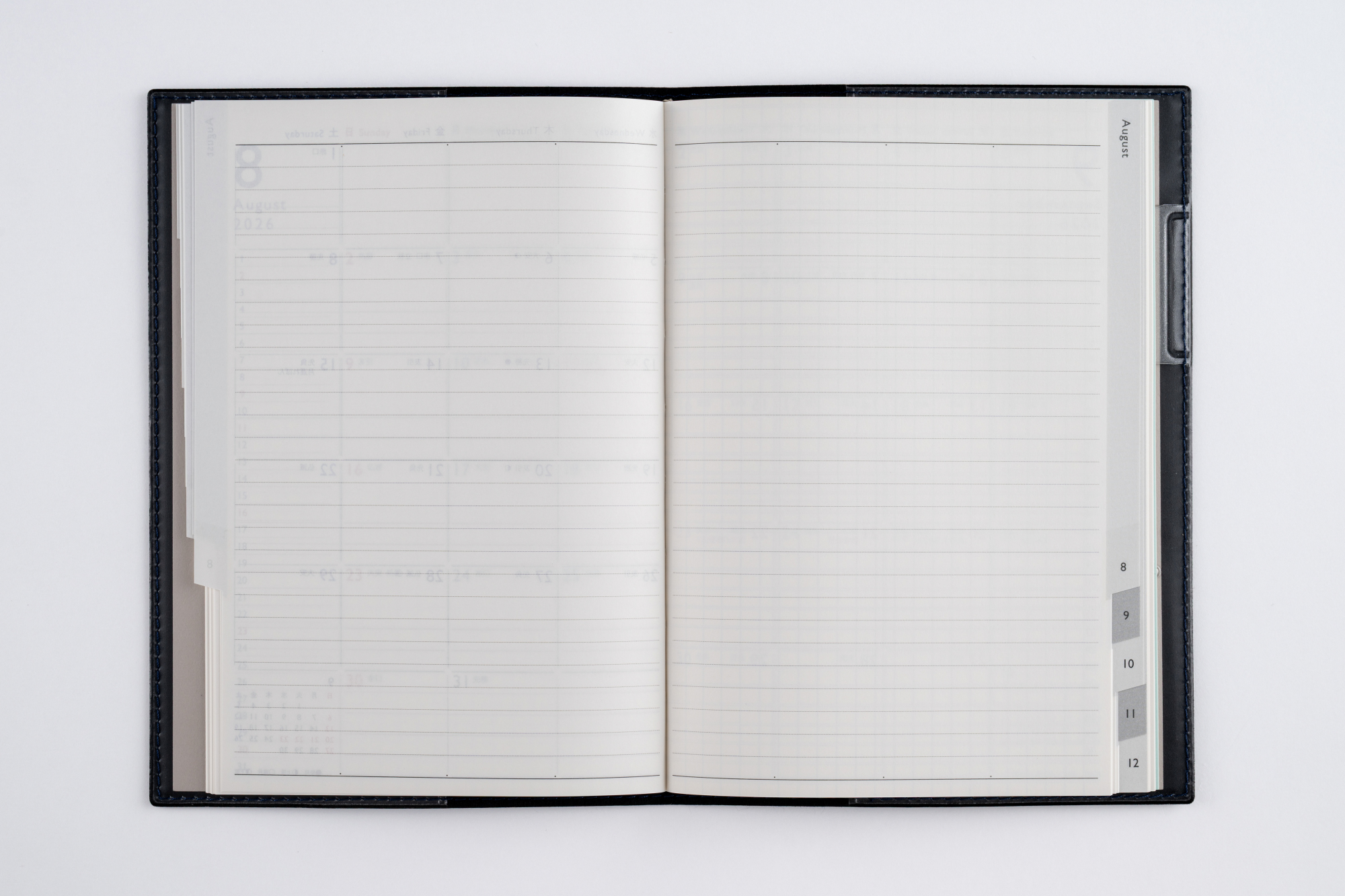 シックなカラーでステッチ入りのカバーは、毎年細部にまでこだわって製作しています。記入スペースと持ち運びやすさのバランスがいいB6サイズ。もっと書きたい方にはA5判の「ディアクレール ラプロ」シリーズもご用意しています。
