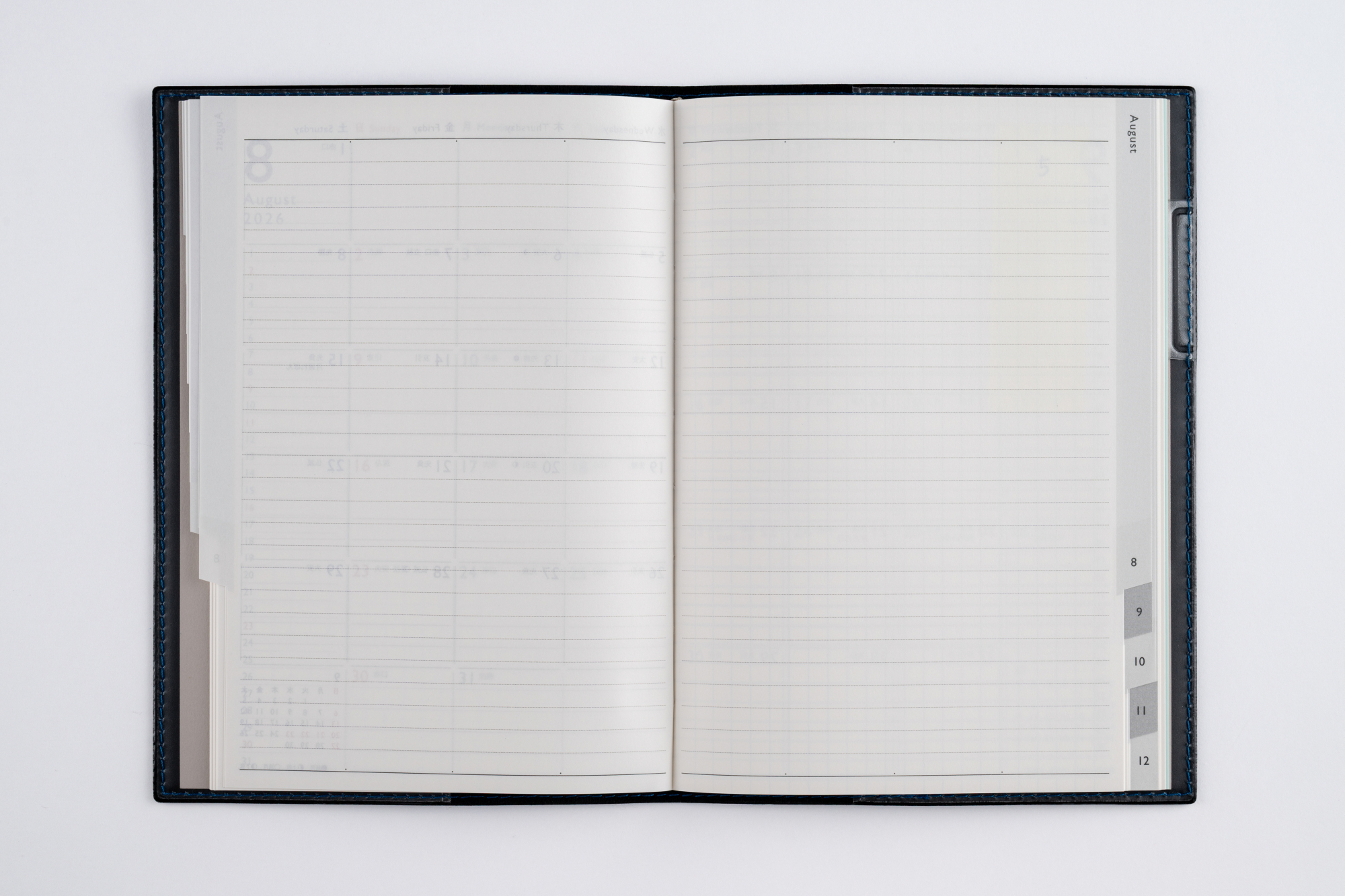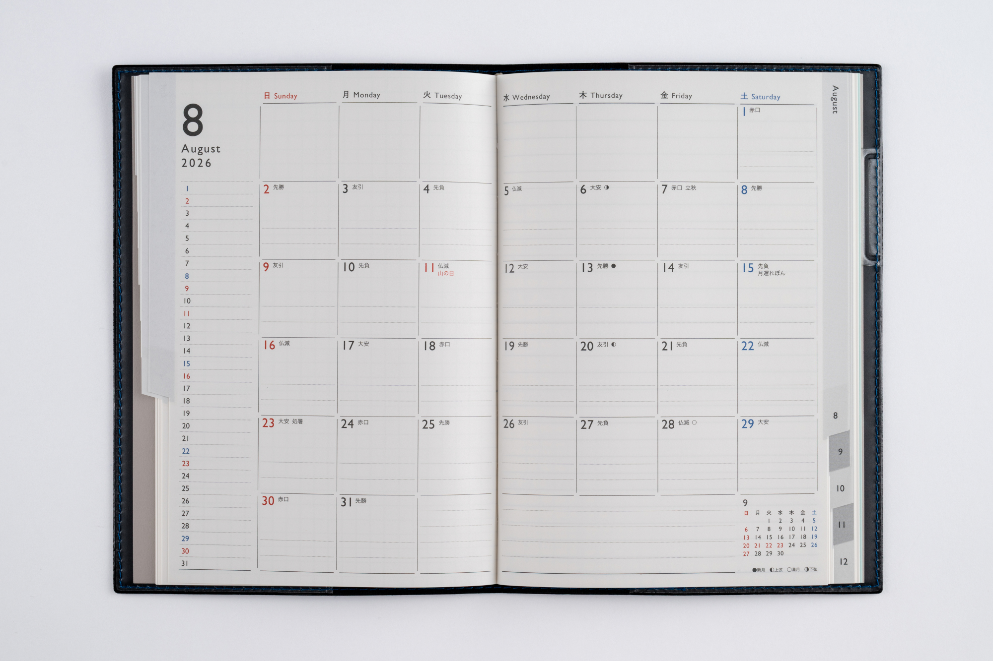シックなカラーでステッチ入りのカバーは、毎年細部にまでこだわって製作しています。記入スペースと持ち運びやすさのバランスがいいB6サイズ。もっと書きたい方にはA5判の「ディアクレール ラプロ」シリーズもご用意しています。