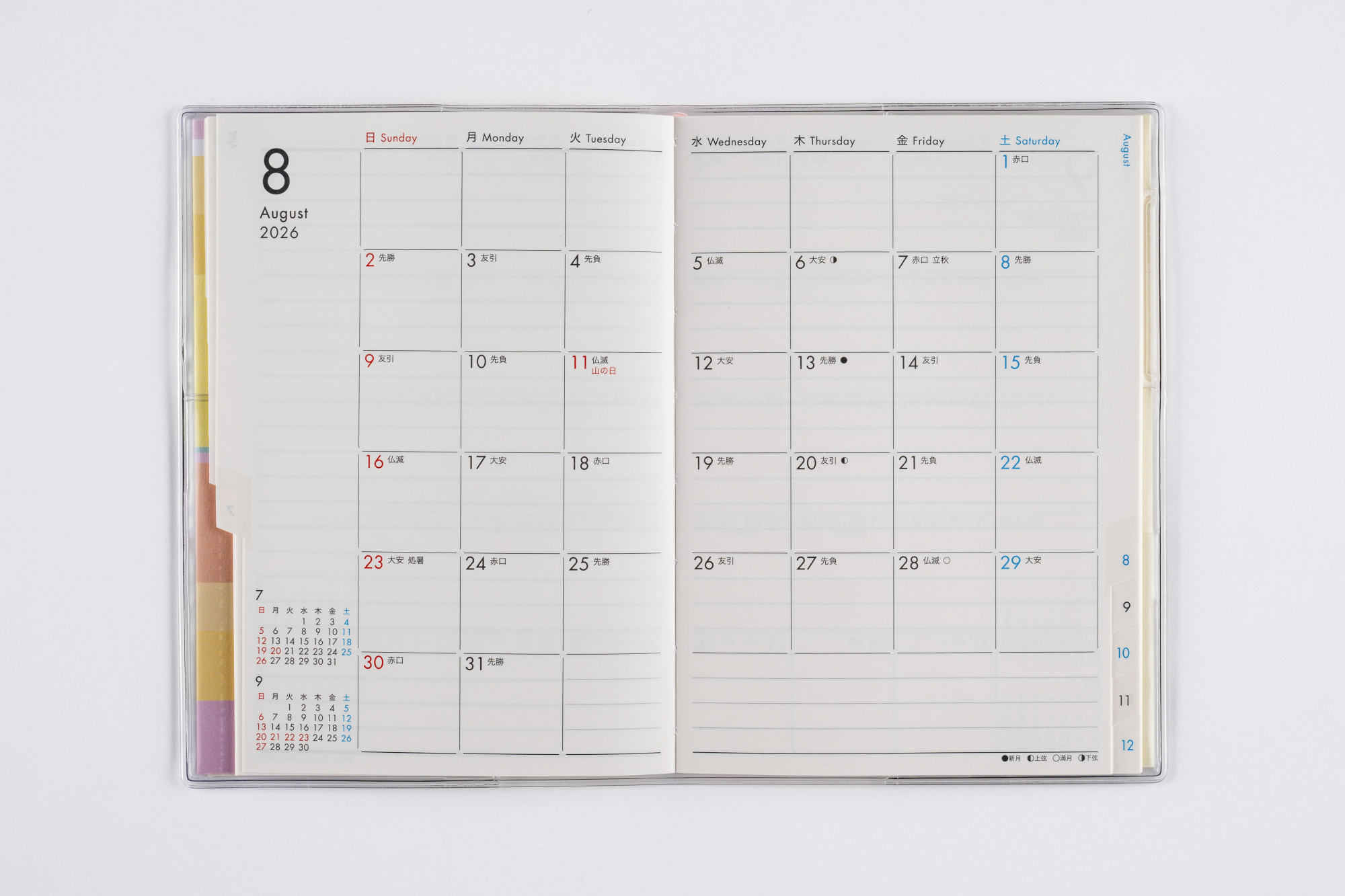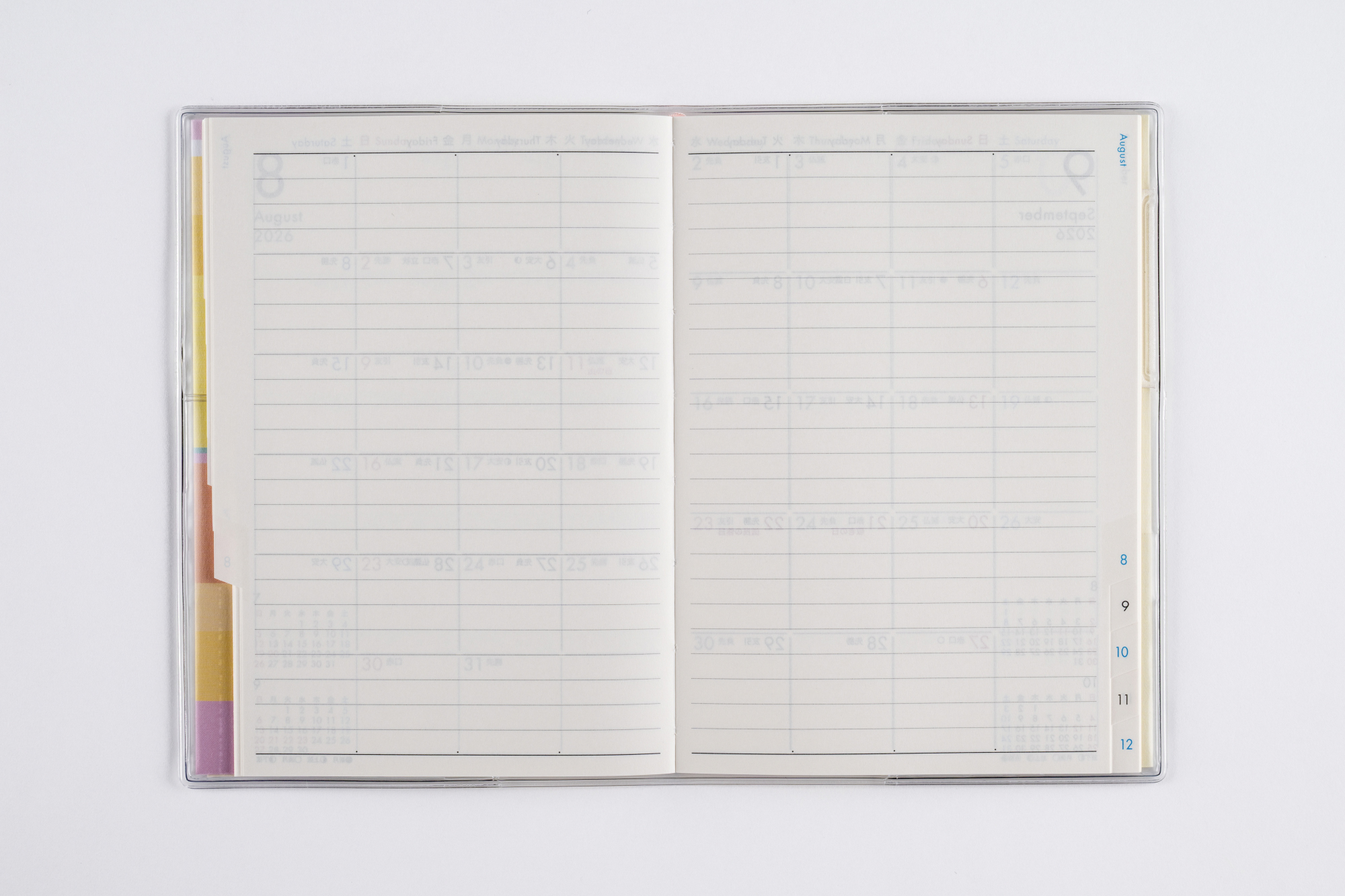 月間予定表のみの薄型タイプで、小さなカバンにもおさまりやすいハンディサイズ! 便利な月別インデックス付き。