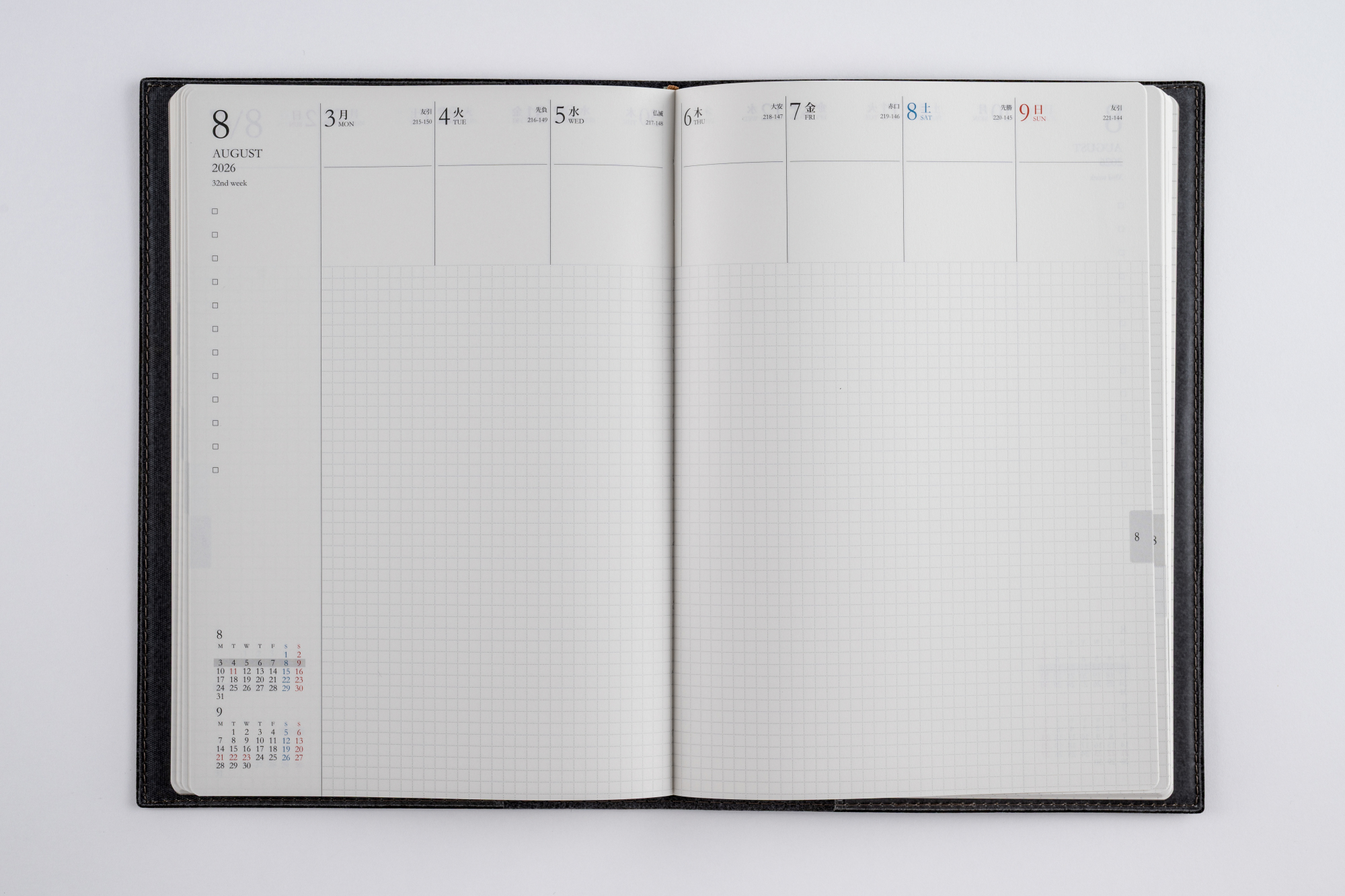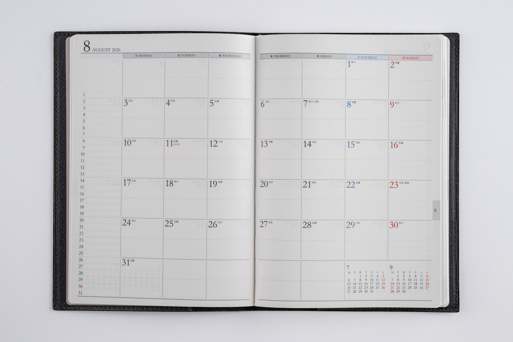 スタンダードな記入形式、上品なフォント、見やすく紙面になじむ刷色など、ストレスなくお使いいただけるのが人気の理由です。月間ページがまとまった月間集約型のページ構成は、月をまたぐ予定管理に便利。