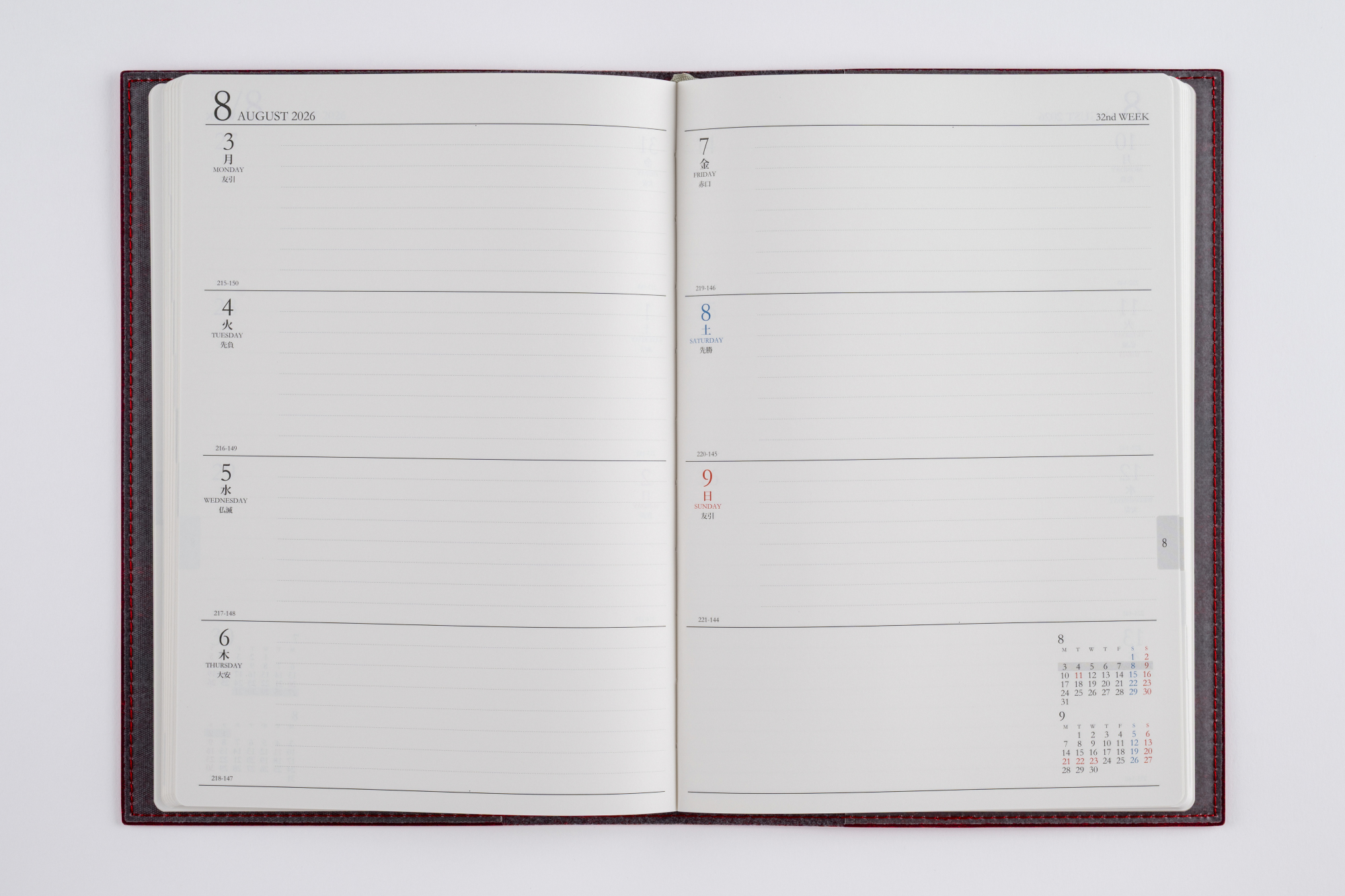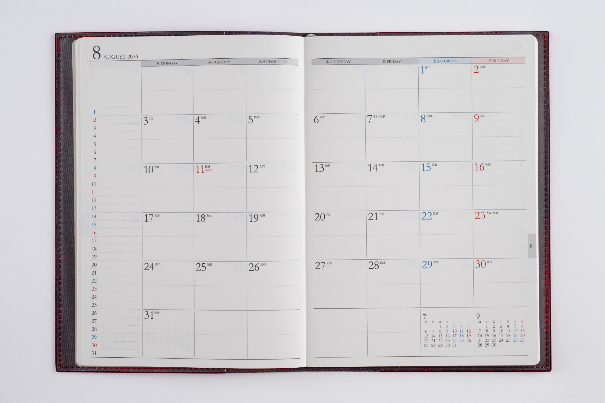 スタンダードな記入形式、上品なフォント、見やすく紙面になじむ刷色など、ストレスなくお使いいただけるのが人気の理由です。月間ページがまとまった月間集約型のページ構成は、月をまたぐ予定管理に便利。