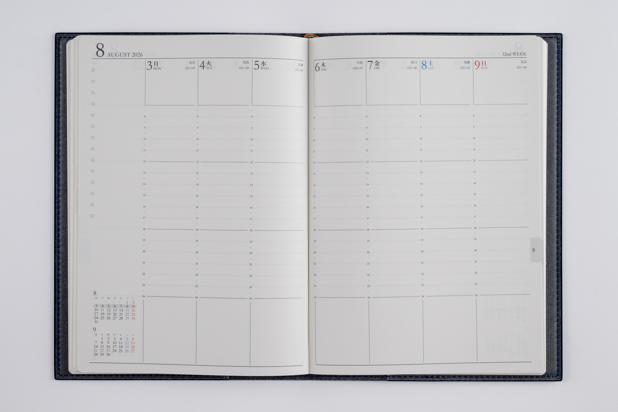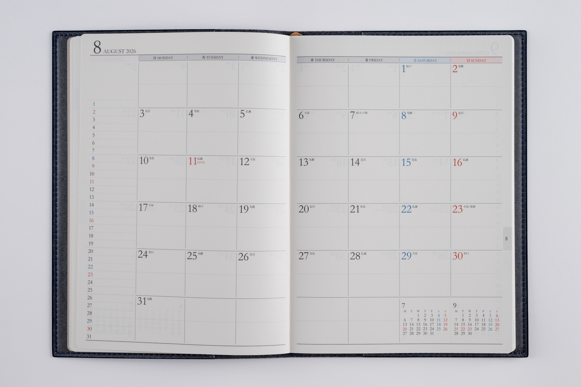 スタンダードな記入形式、上品なフォント、見やすく紙面になじむ刷色など、ストレスなくお使いいただけるのが人気の理由です。月間ページがまとまった月間集約型のページ構成は、月をまたぐ予定管理に便利。