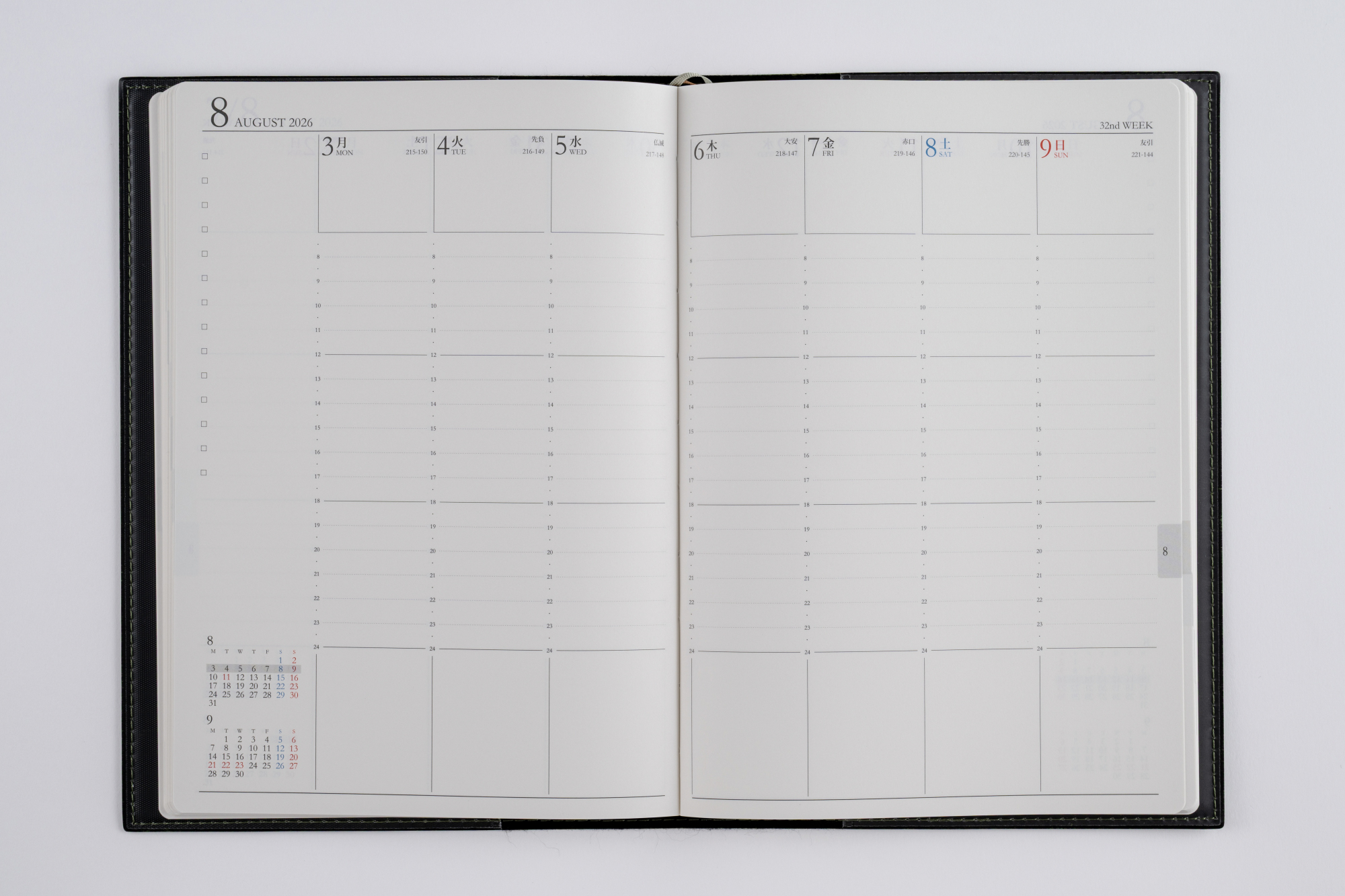 スタンダードな記入形式、上品なフォント、見やすく紙面になじむ刷色など、ストレスなくお使いいただけるのが人気の理由です。月間ページがまとまった月間集約型のページ構成は、月をまたぐ予定管理に便利。