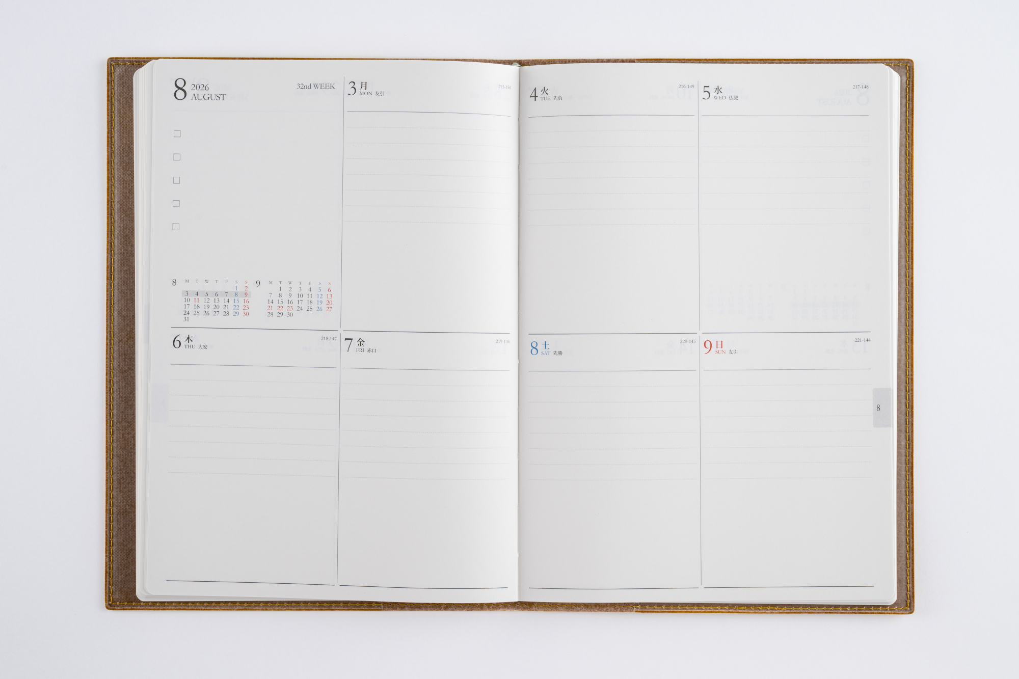 スタンダードな記入形式、上品なフォント、見やすく紙面になじむ刷色など、ストレスなくお使いいただけるのが人気の理由です。月間ページがまとまった月間集約型のページ構成は、月をまたぐ予定管理に便利。