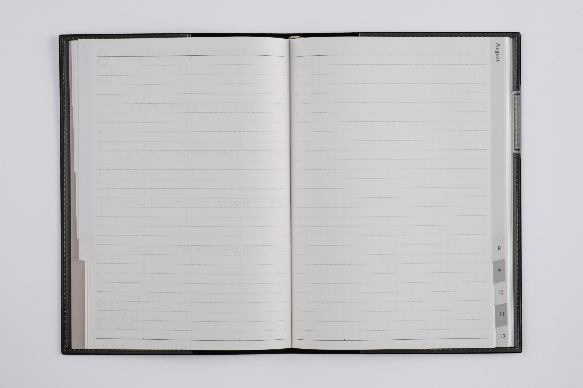 シックなカラーでステッチ入りのカバーは、毎年細部にまでこだわって製作しています。デスクで書くのにちょうどいいA5判で、マンスリータイプでもしっかり書きたい人にオススメです。持ち運び重視の方にはB6判の「ディアクレール」シリーズもご用意しています。