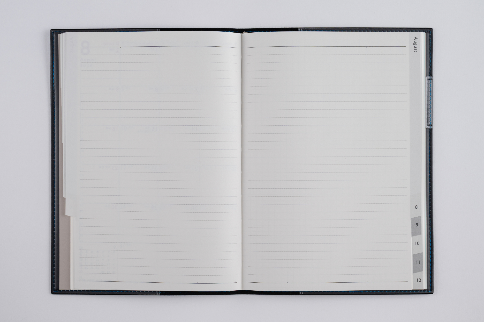 シックなカラーでステッチ入りのカバーは、毎年細部にまでこだわって製作しています。デスクで書くのにちょうどいいA5判で、マンスリータイプでもしっかり書きたい人にオススメです。持ち運び重視の方にはB6判の「ディアクレール」シリーズもご用意しています。