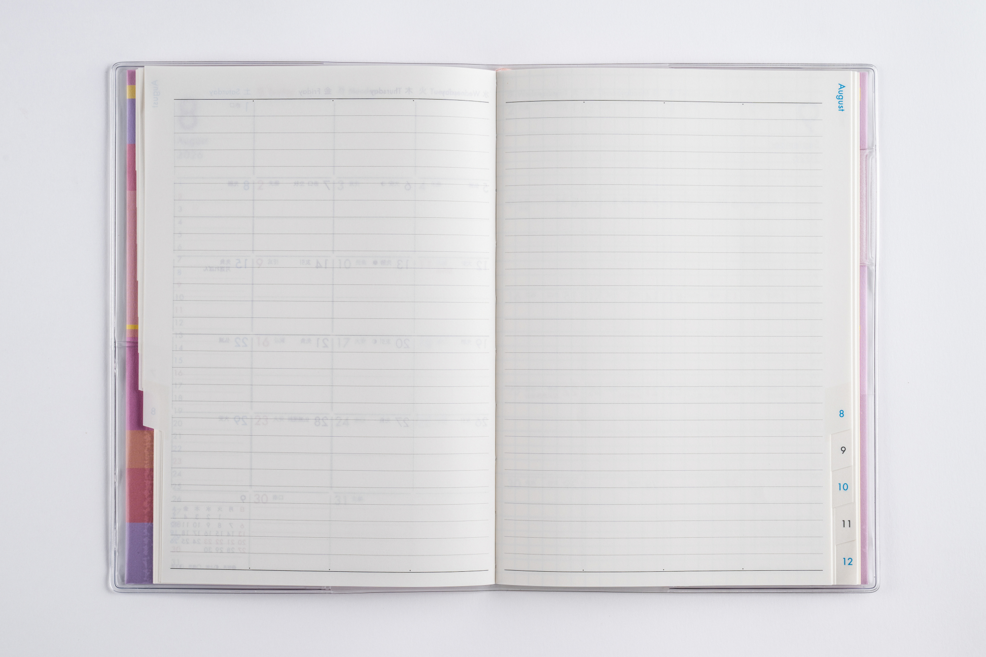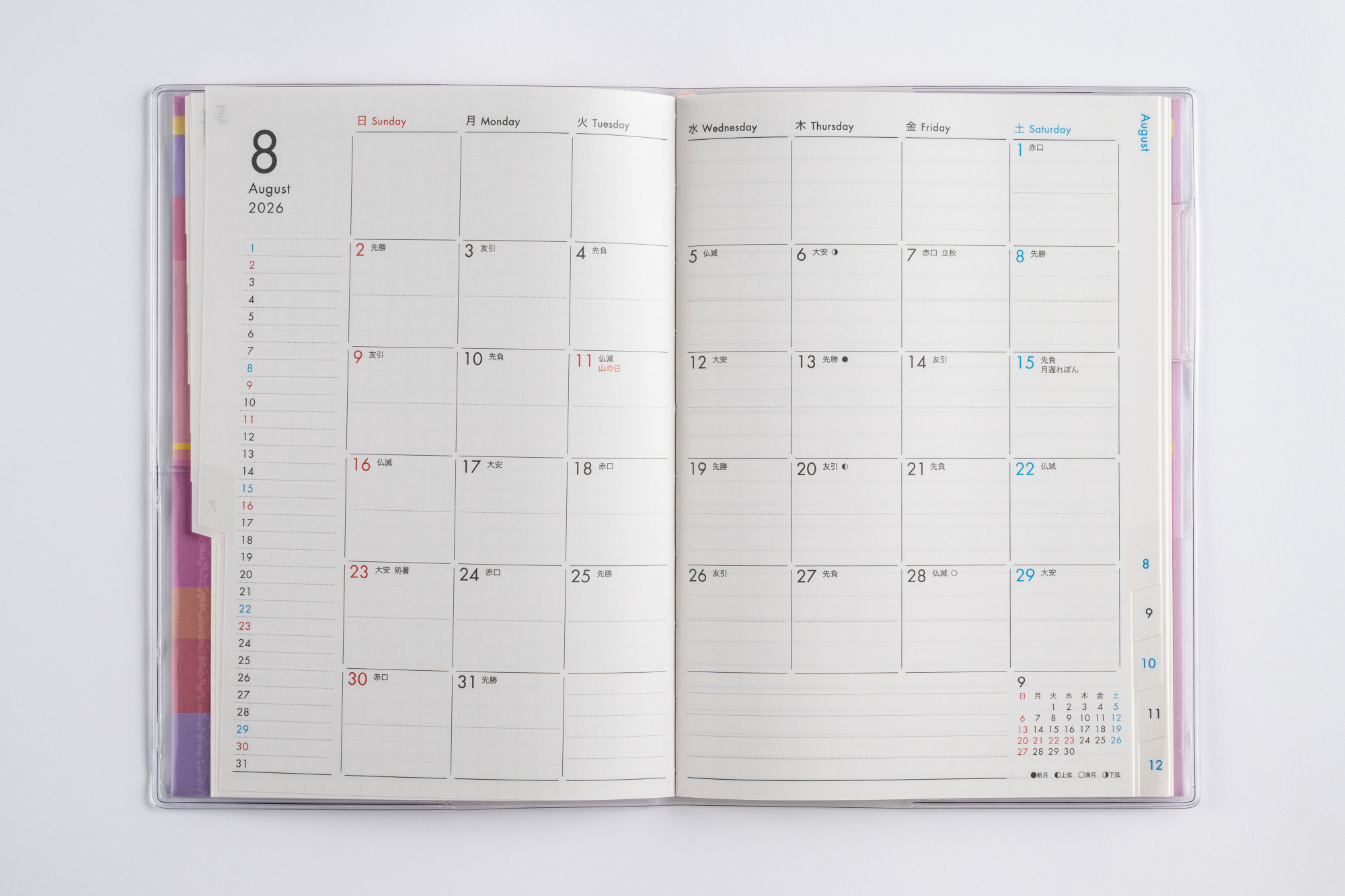 月間予定表のみの薄型タイプで、持ち運んで気軽に使いやすいベーシックなB6判。便利な月別インデックス付きなので、見たいページをパッと開けます。