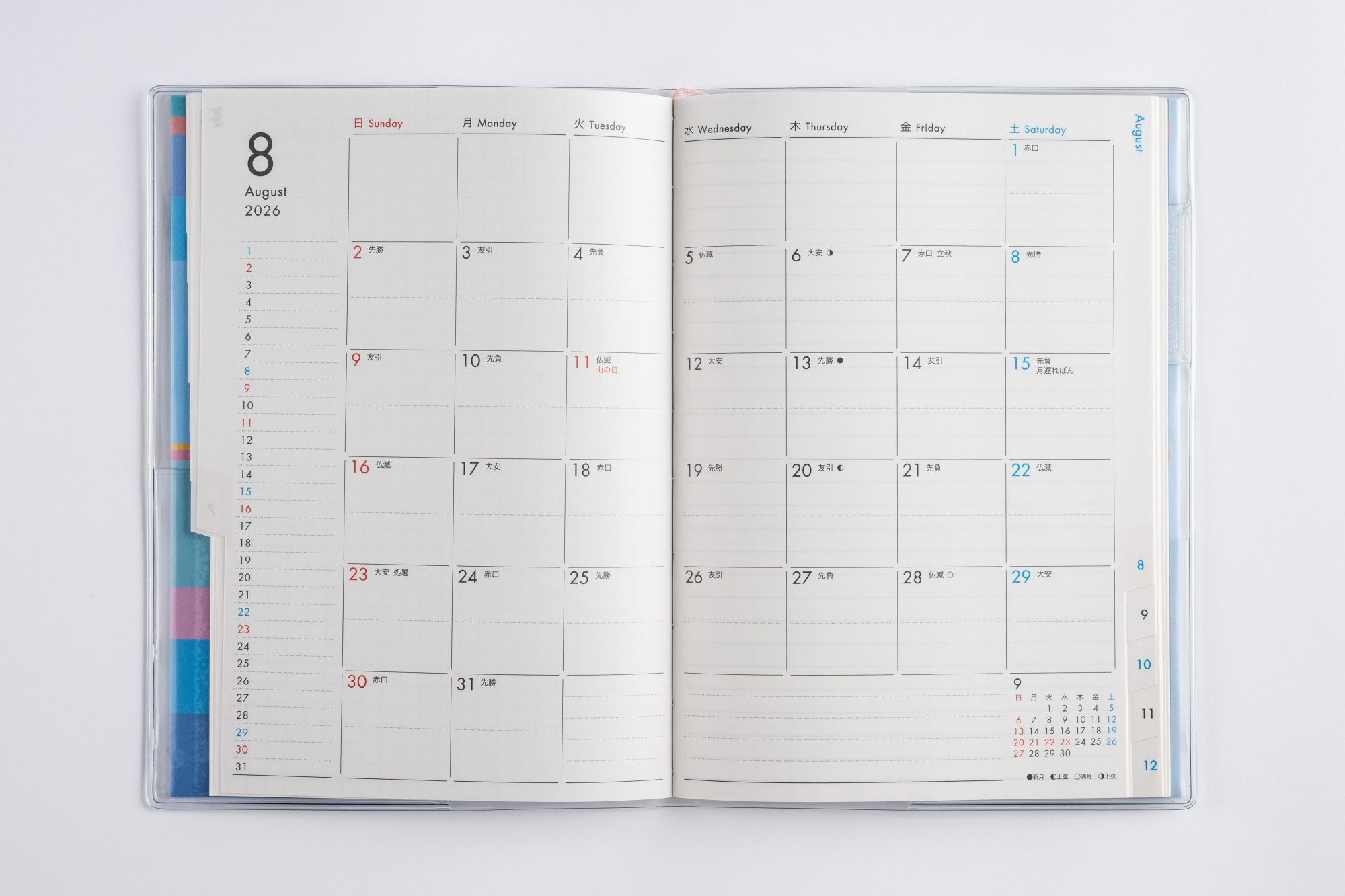 月間予定表のみの薄型タイプで、持ち運んで気軽に使いやすいベーシックなB6判。便利な月別インデックス付きなので、見たいページをパッと開けます。