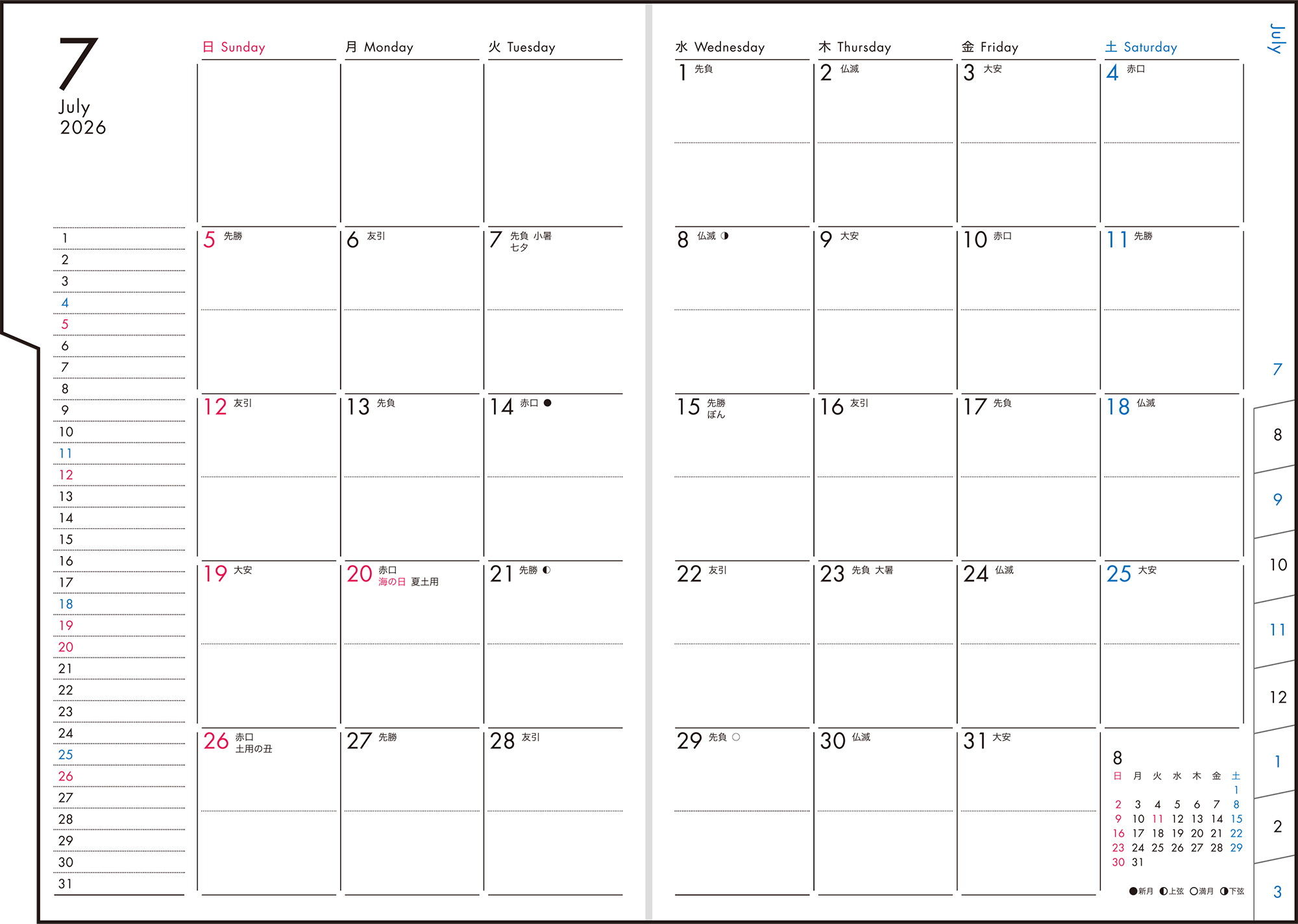 月間予定表のみの薄型タイプで、職場や自宅でゆったり書けるA5判。メモページも多いので、書きたい量が多い方にオススメです。便利な月別インデックス付き。