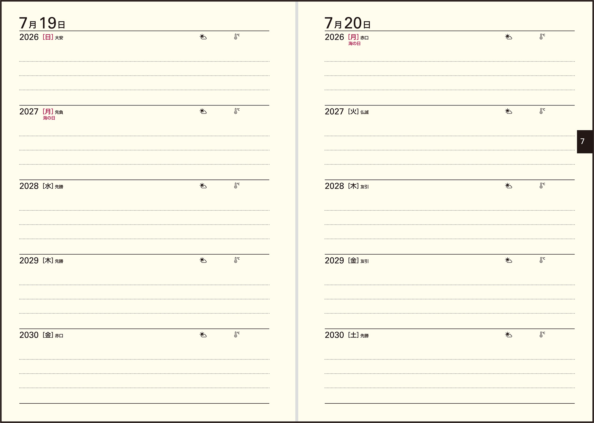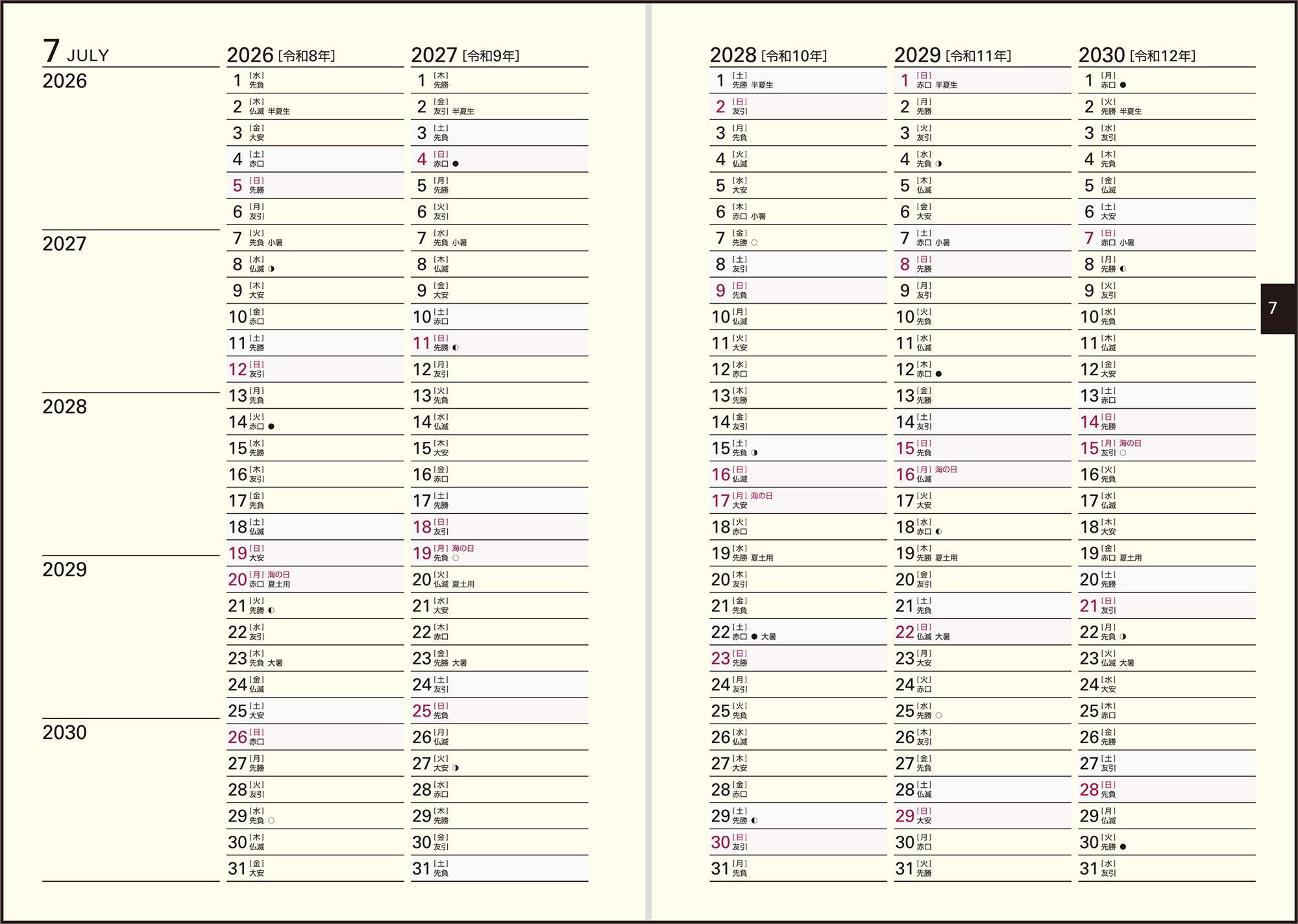 見開き1ヶ月×5年分の横ケイ式カレンダーは、年ごとのスケジュールの比較に便利です。