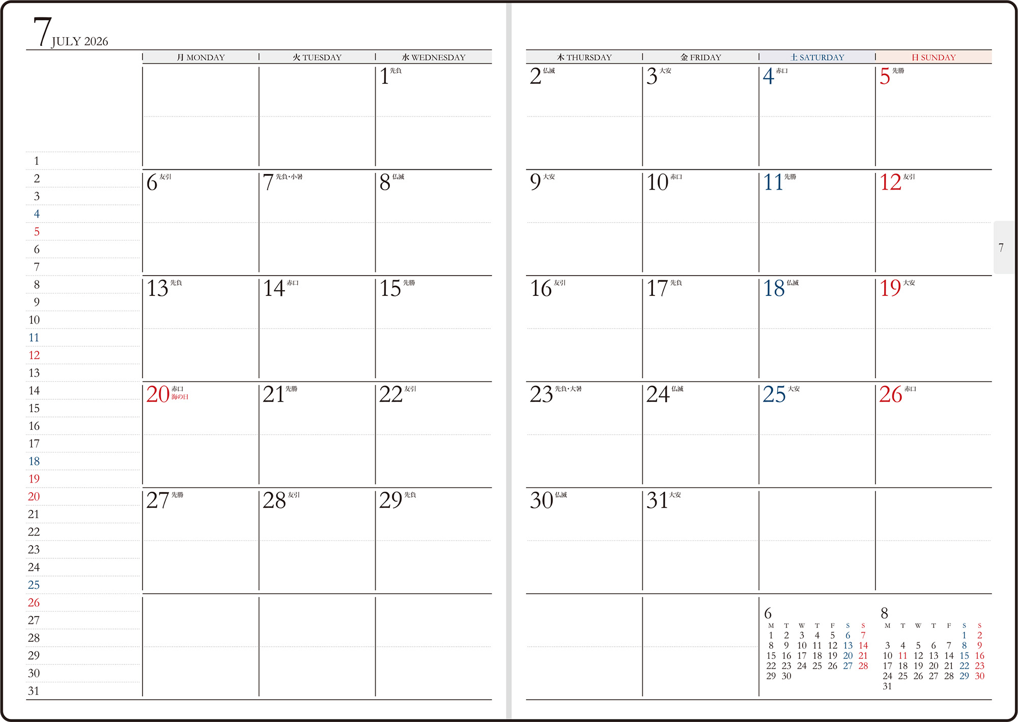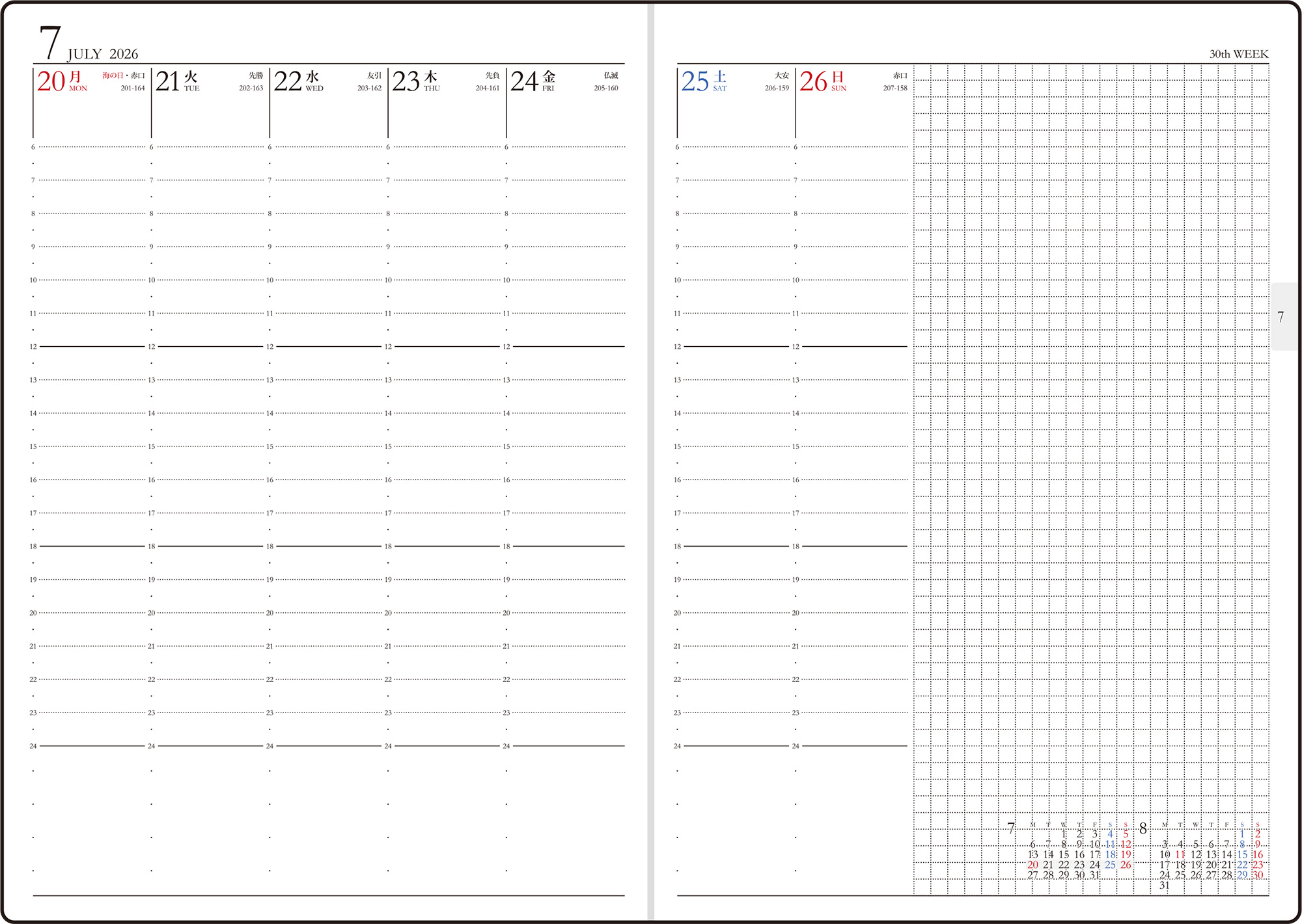 スタンダードな記入形式、上品なフォント、見やすく紙面になじむ刷色など、ストレスなくお使いいただけるのが人気の理由です。月間ページがまとまった月間集約型のページ構成は、月をまたぐ予定管理に便利。