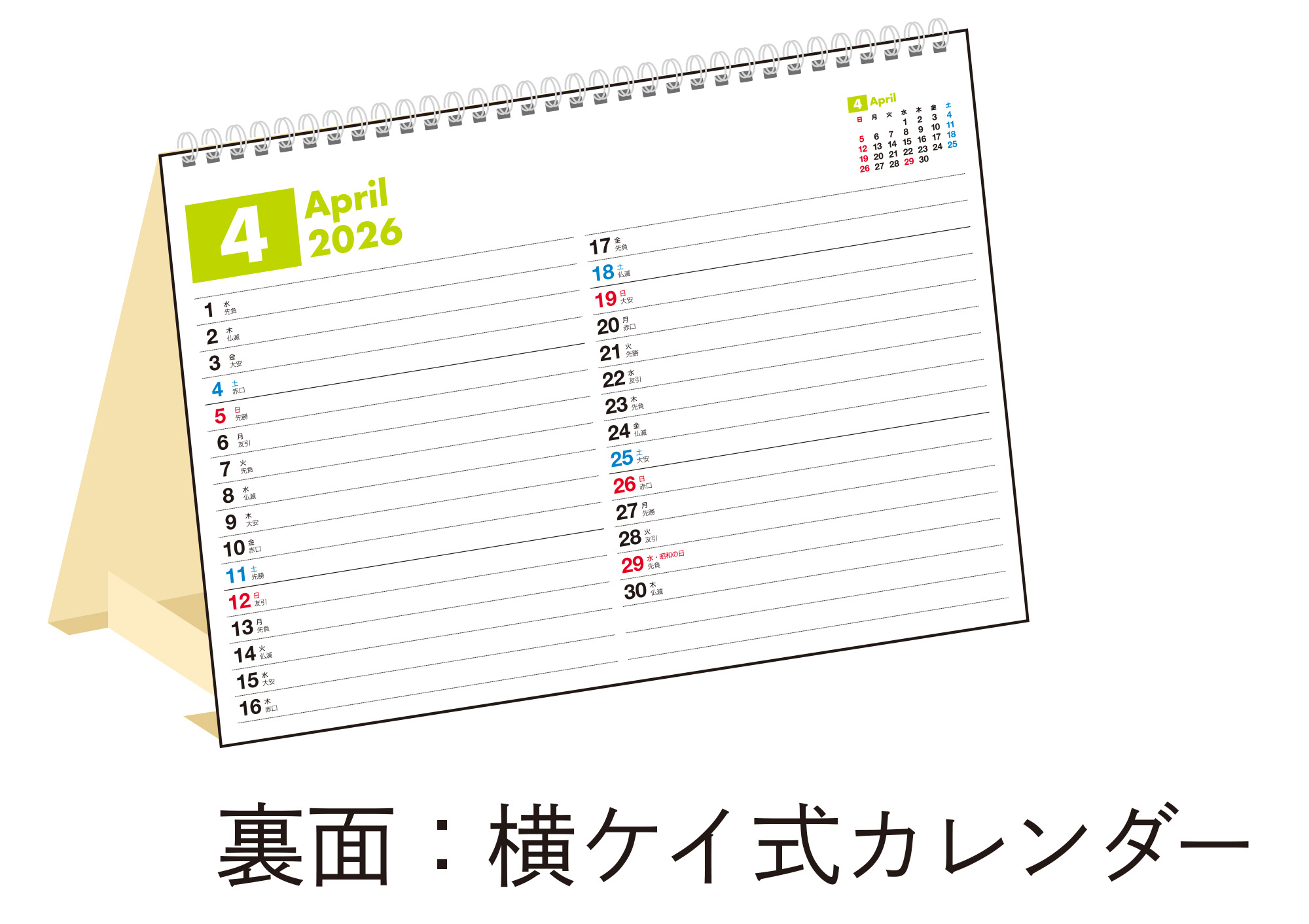 ポップでカラフルな卓上カレンダー。月ごとに色がかわるので、めくるたびに気分を一新できます。裏面の横ケイ式カレンダーは、長期的な予定や進捗の管理に便利です。2年分を一覧できる年間カレンダーが付いているので、長期計画の立案もしっかりサポートしてくれます。